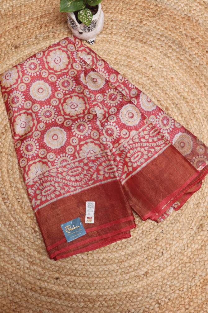 Wrapped in the warmth of  traditional craftsmanship, this handpainted Gachi Tussar saree is a study in quiet elegance. The rich brick red hue, a color of grounded passion and timeless beauty, serves as a canvas for the delicate handpainted details. Each brushstroke tells a story, making this not just a garment but a wearable piece of art. The natural texture of the Gachhi Tussar silk lends an earthy, rustic feel, ensuring a drape that is both luxurious and effortlessly graceful. Perfect for a special occasion or an intimate gathering, this saree invites you to carry a piece of art wherever you go.