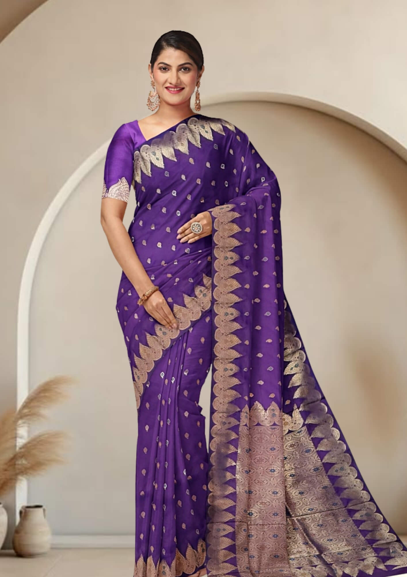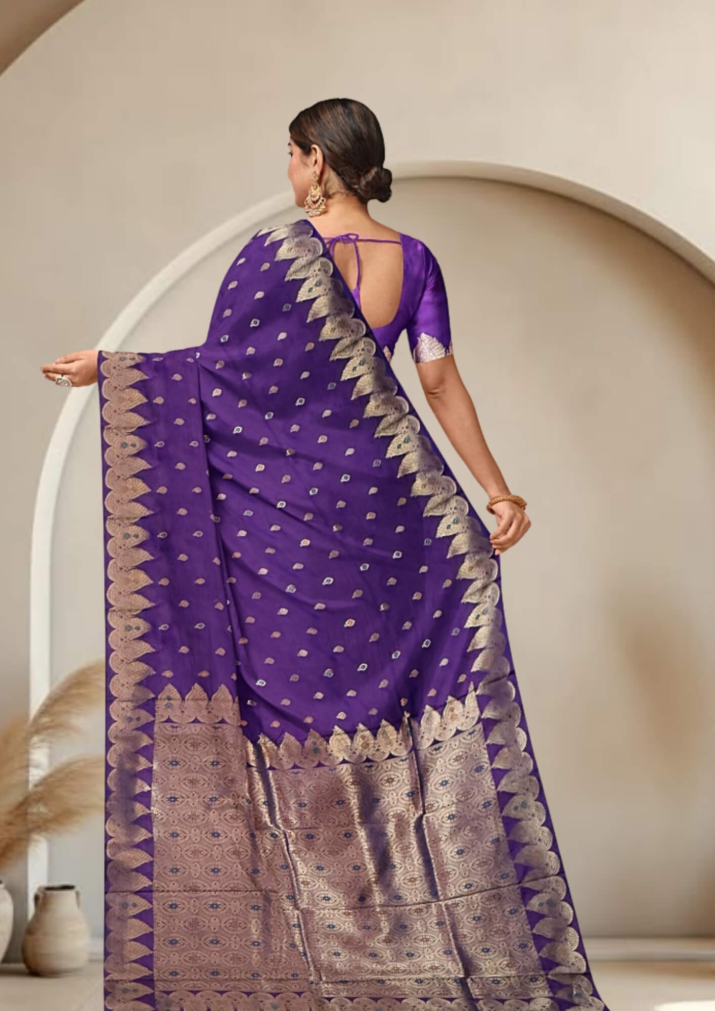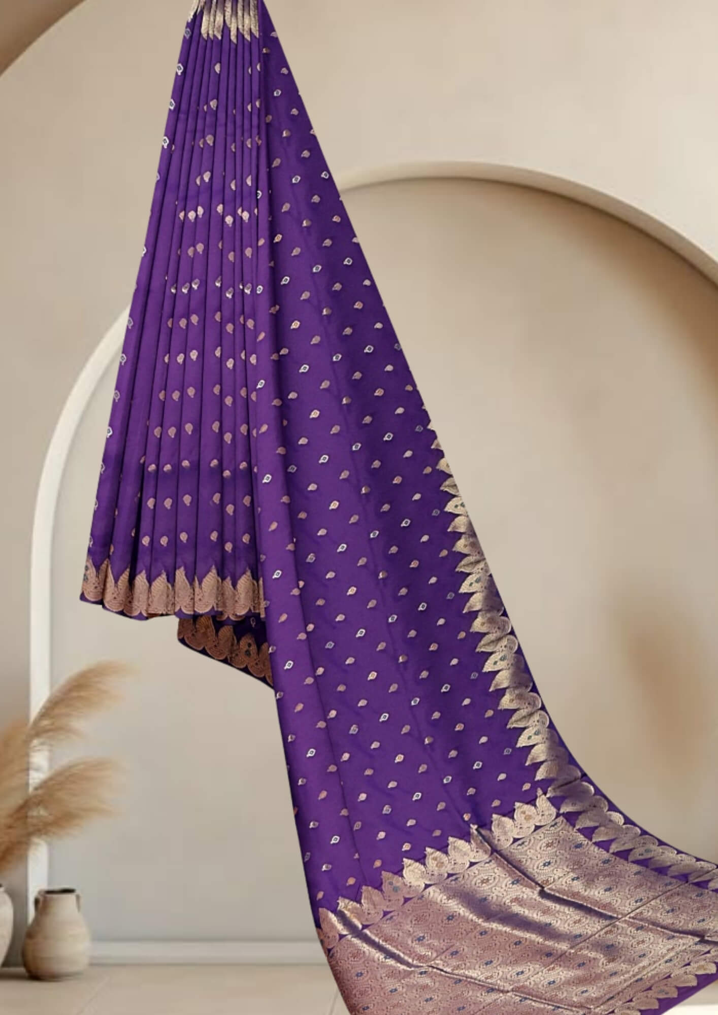 The saree's captivating violet shade evokes a sense of royalty, mystery, and sophistication. This rich, deep color provides a stunning canvas for the intricate zari work, making it a standout piece for any discerning wearer.