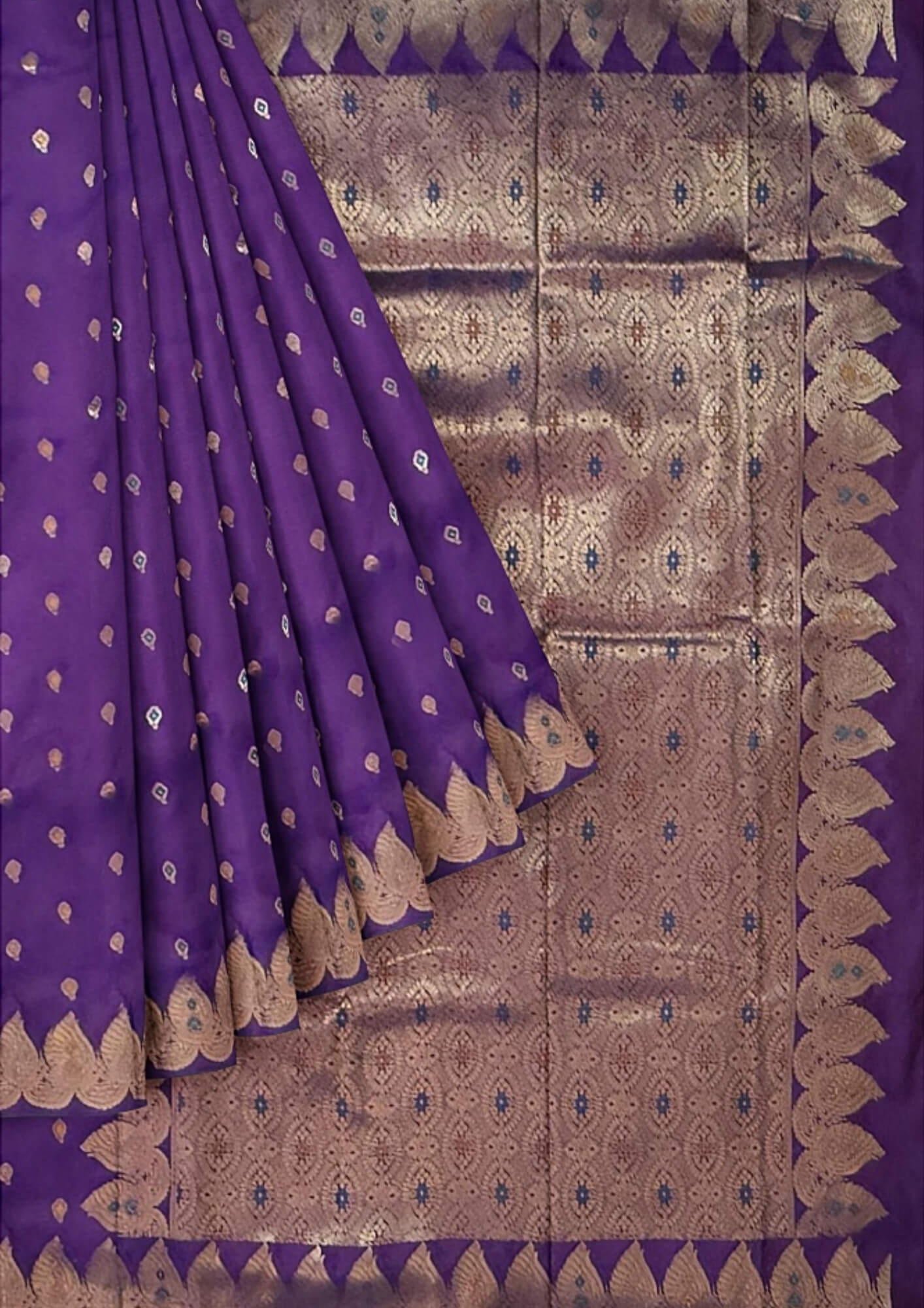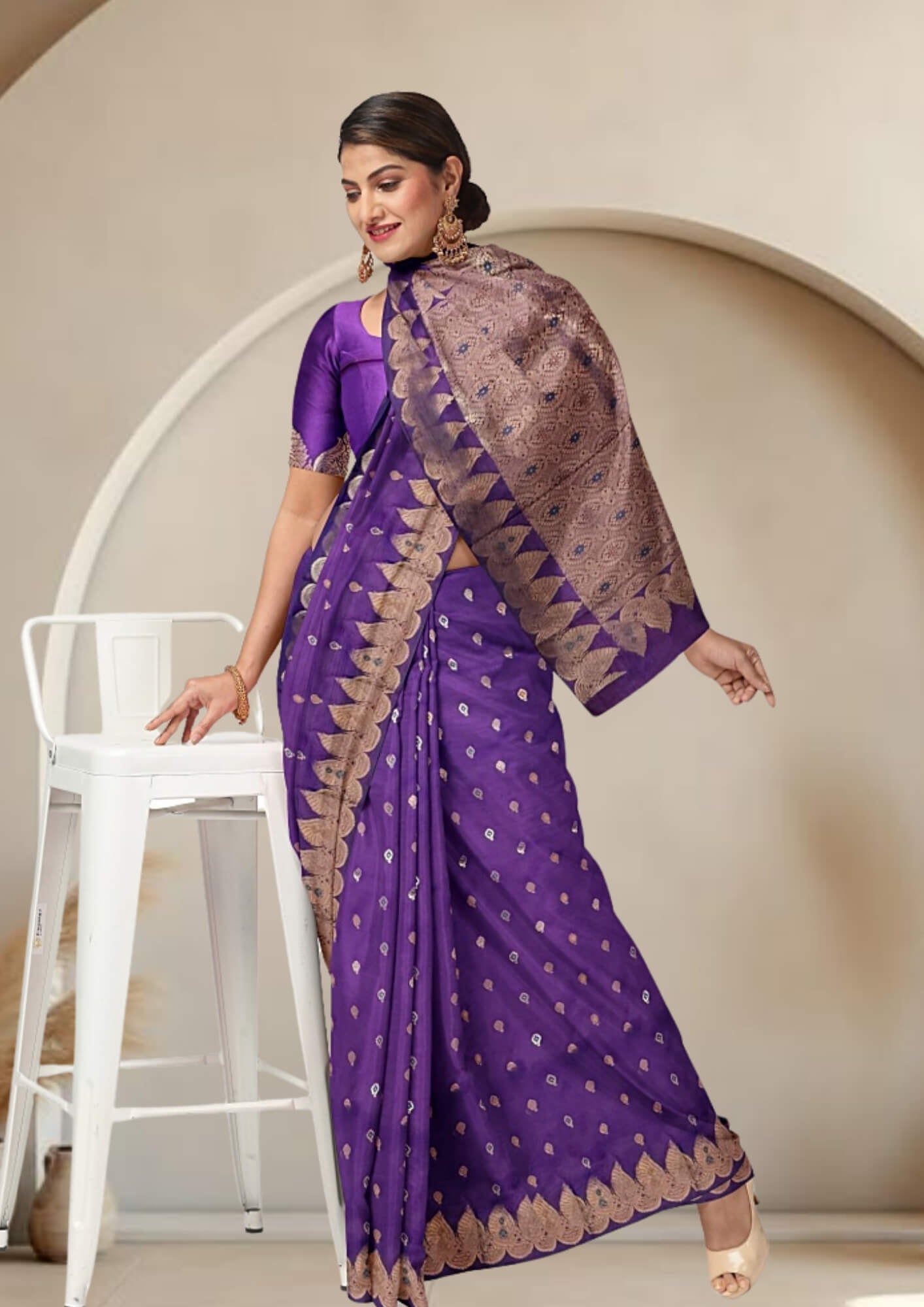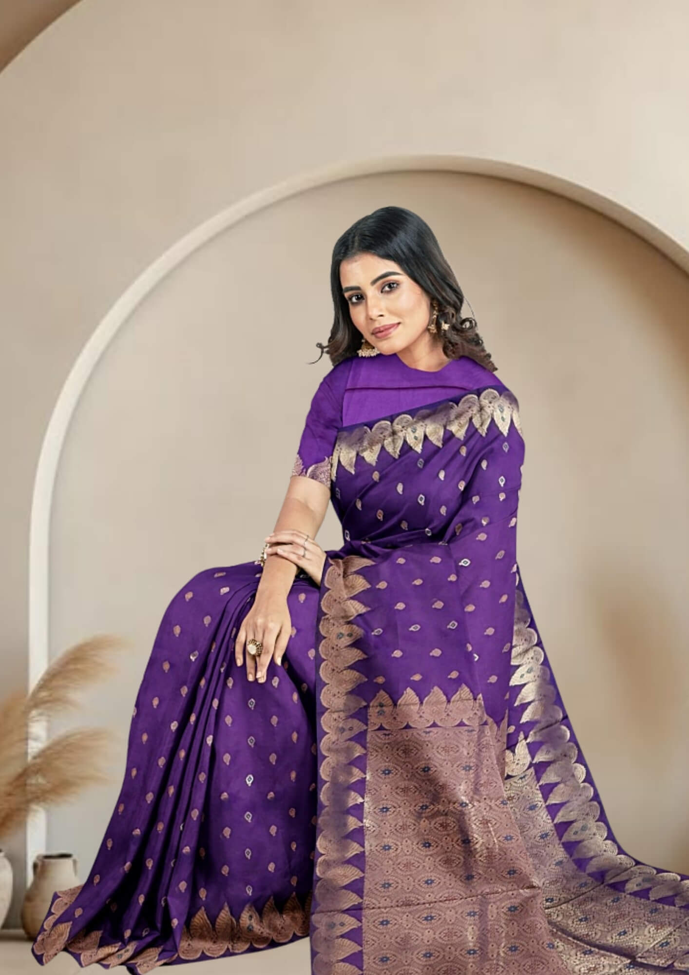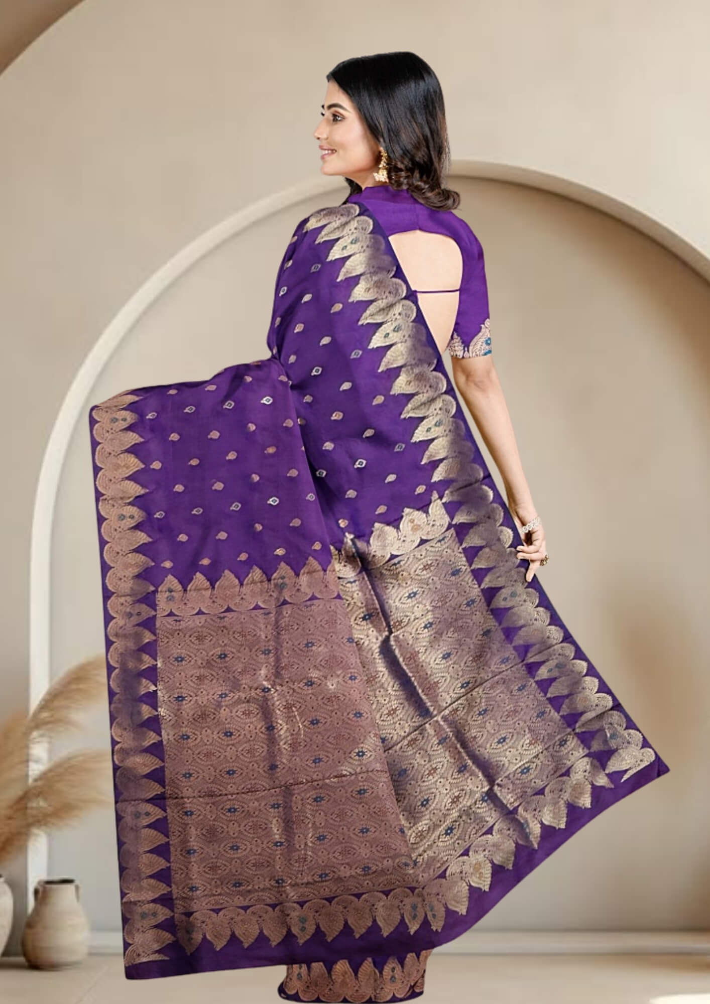 The saree's captivating violet shade evokes a sense of royalty, mystery, and sophistication. This rich, deep color provides a stunning canvas for the intricate zari work, making it a standout piece for any discerning wearer.