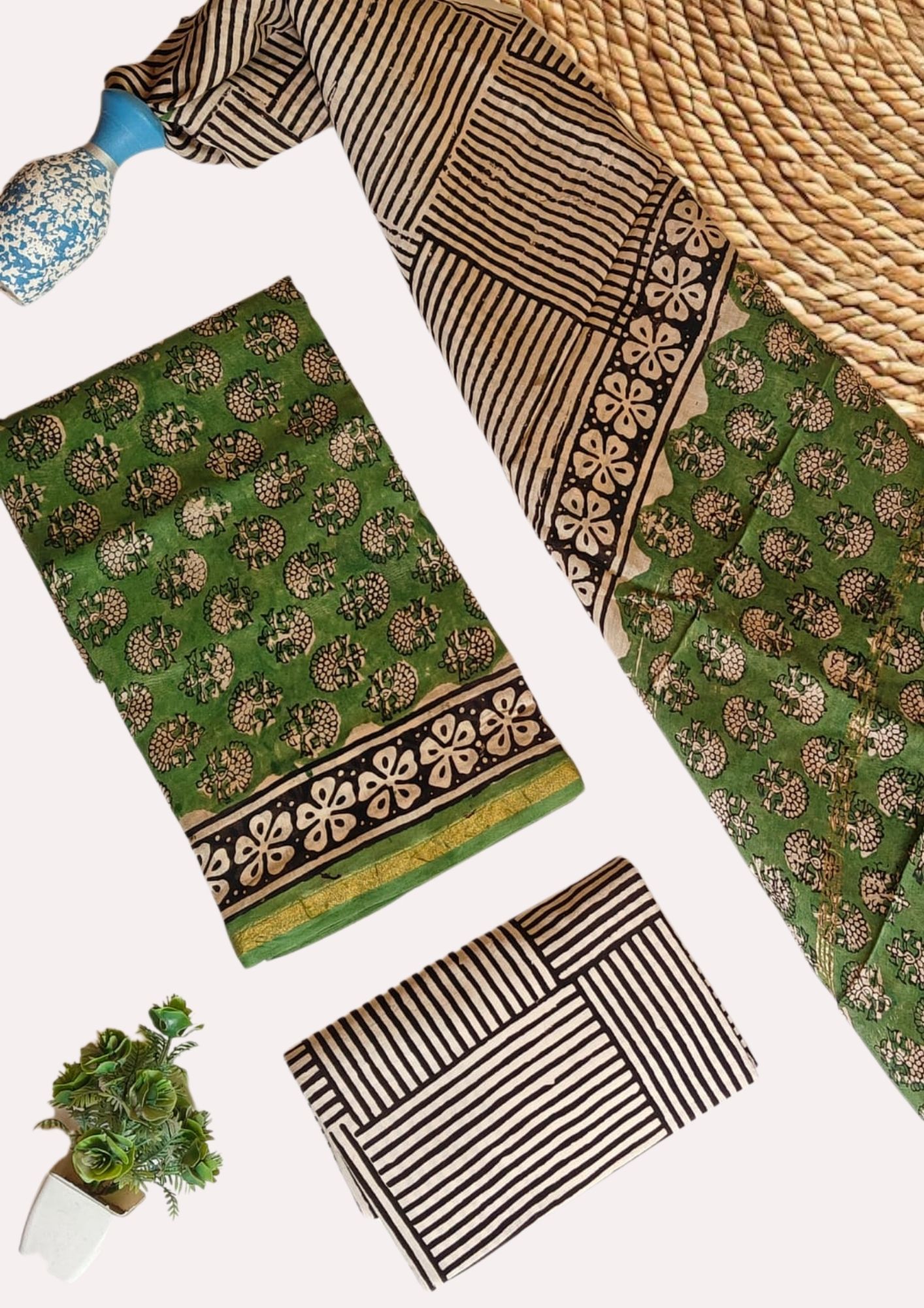 Green and Off-White Chanderi Suit Set