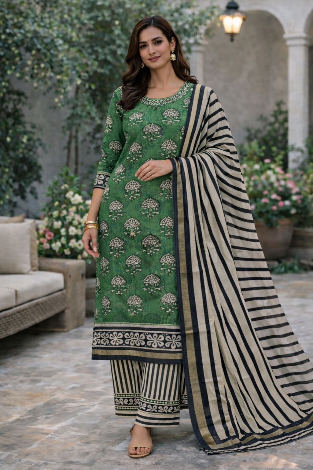 Embrace the classic beauty and artisanal texture of our Green and Off-White Chanderi Suit Set. Chanderi fabric is highly prized for its luxurious feel, lightweight texture, and subtle, sophisticated sheen. The pairing of a calming Green hue with crisp Off-White creates a beautiful contrast that is both fresh and timelessly elegant. This ensemble is perfect for formal daytime events, semi-casual gatherings, and occasions where you desire a look that is both traditional and refined.