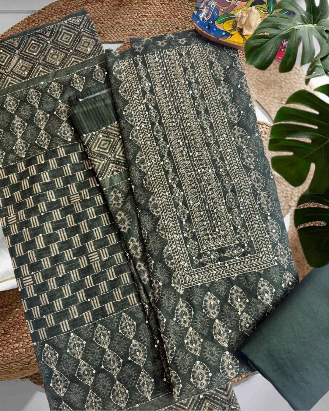 Embrace the earthy charm of our Green Embroidered Maheshwari Suit Set. This beautiful unstitched ensemble brings together the legendary lightness of Maheshwari silk-cotton with rich, sophisticated detailing. The Maheshwari Kurta drapes elegantly and features exquisite embroidery work that adds a refined touch of artistry, making this suit ideal for formal daytime events or elegant evening gatherings.