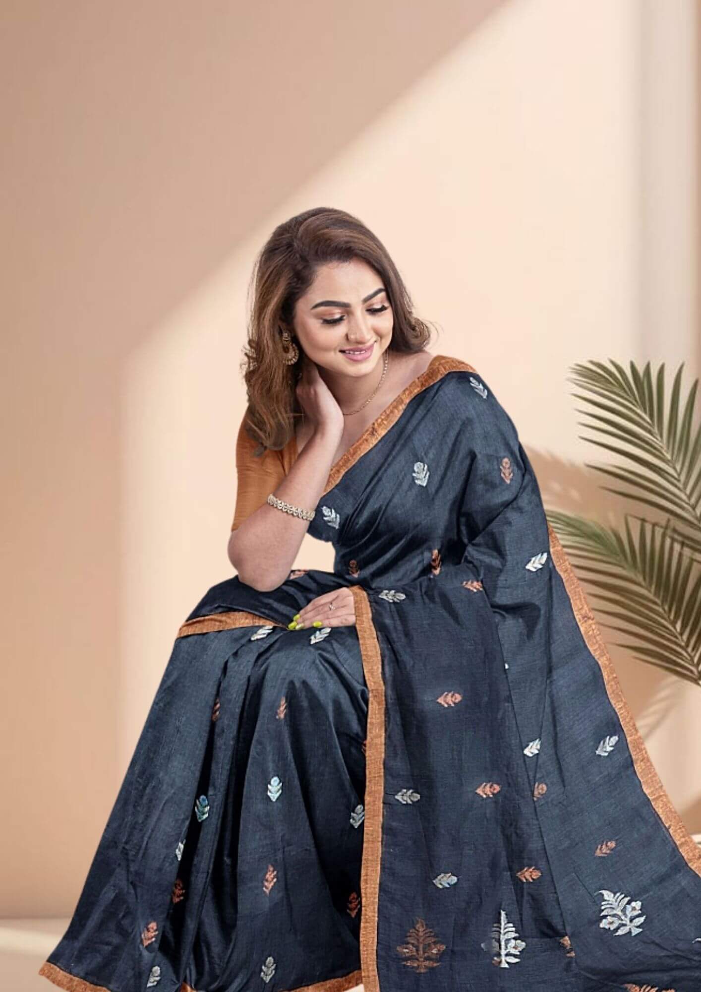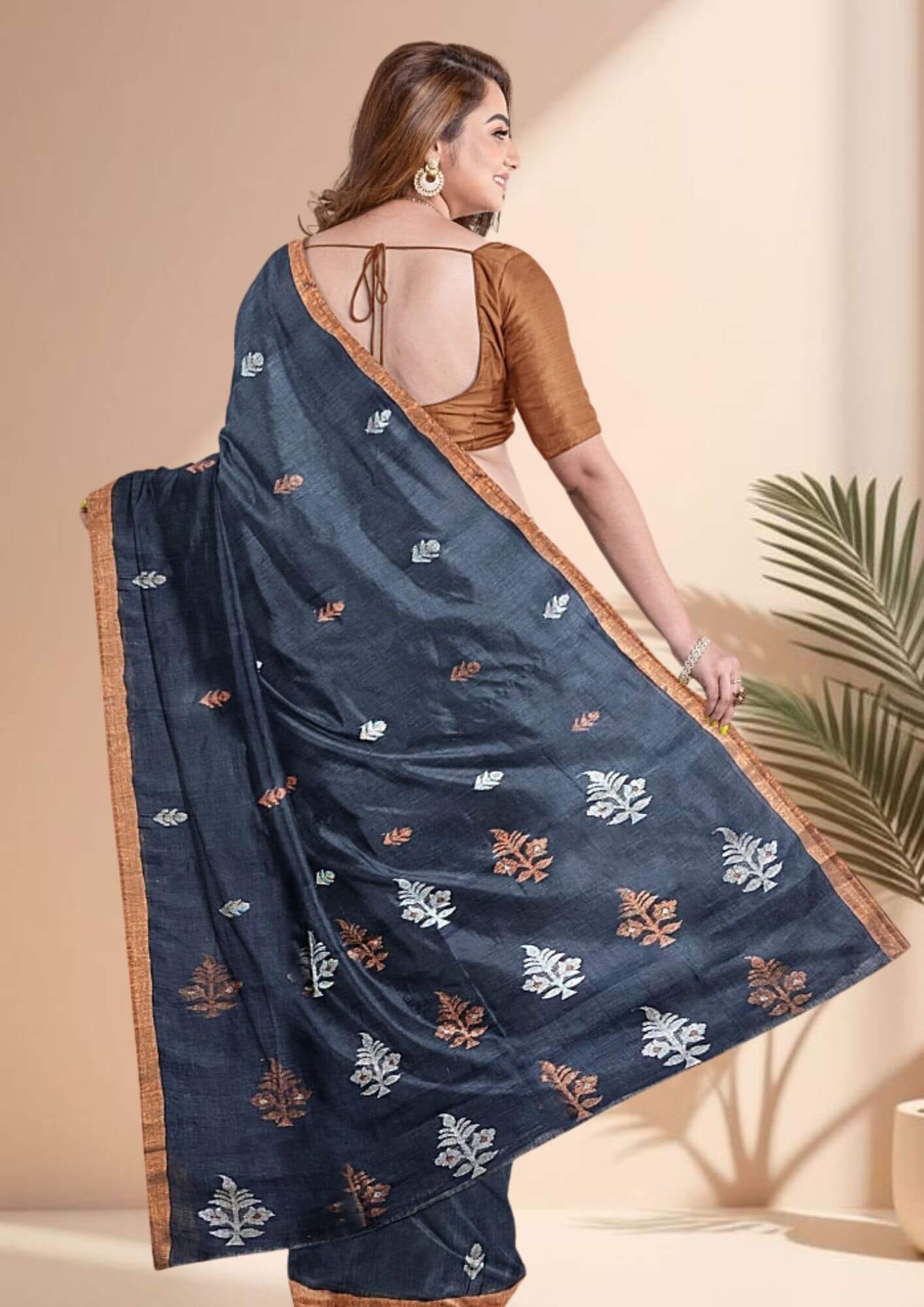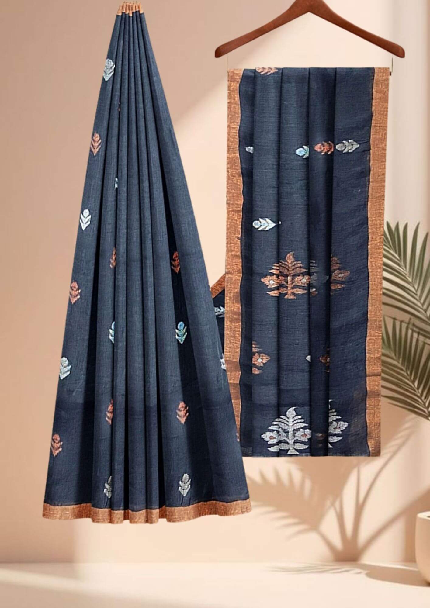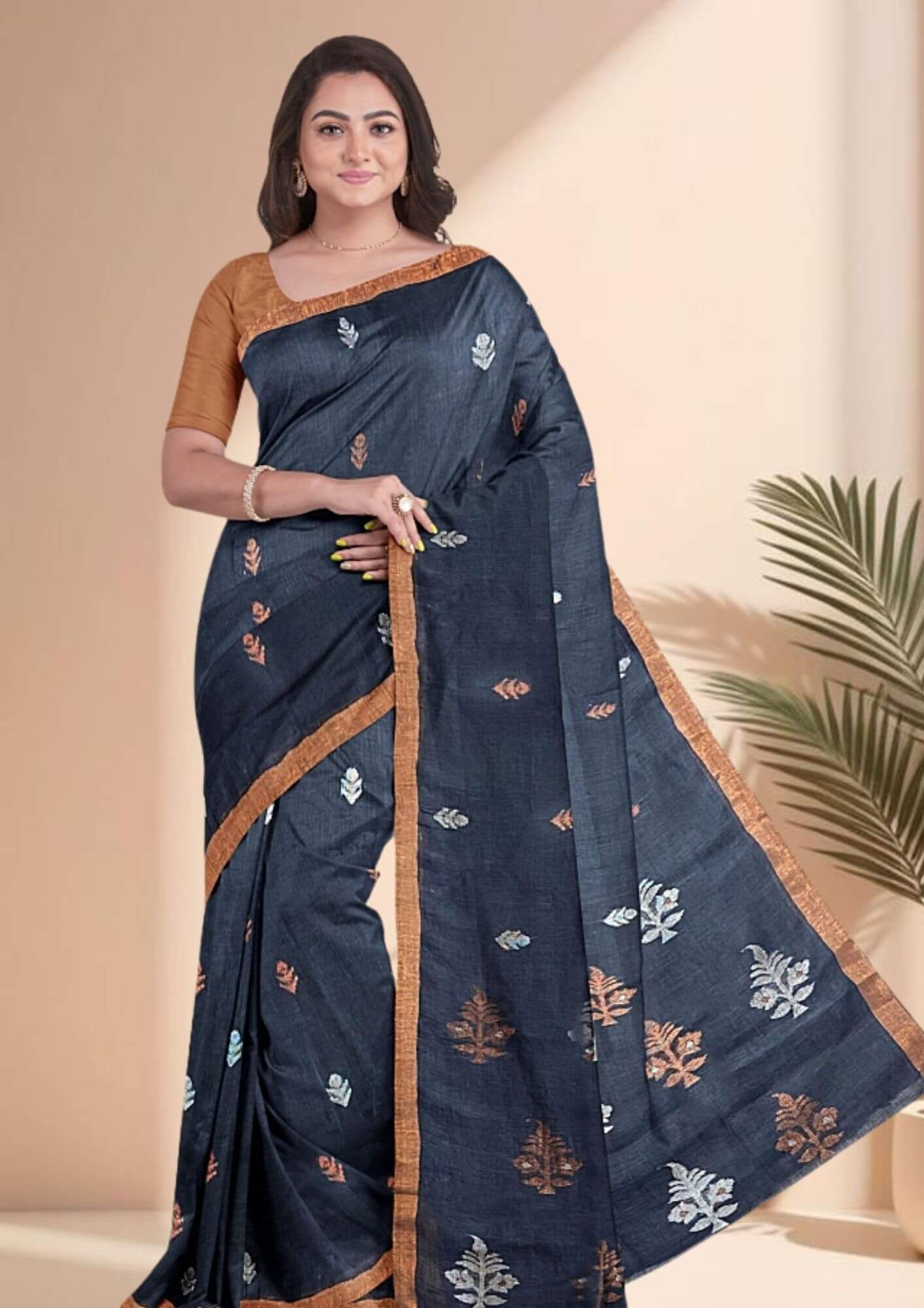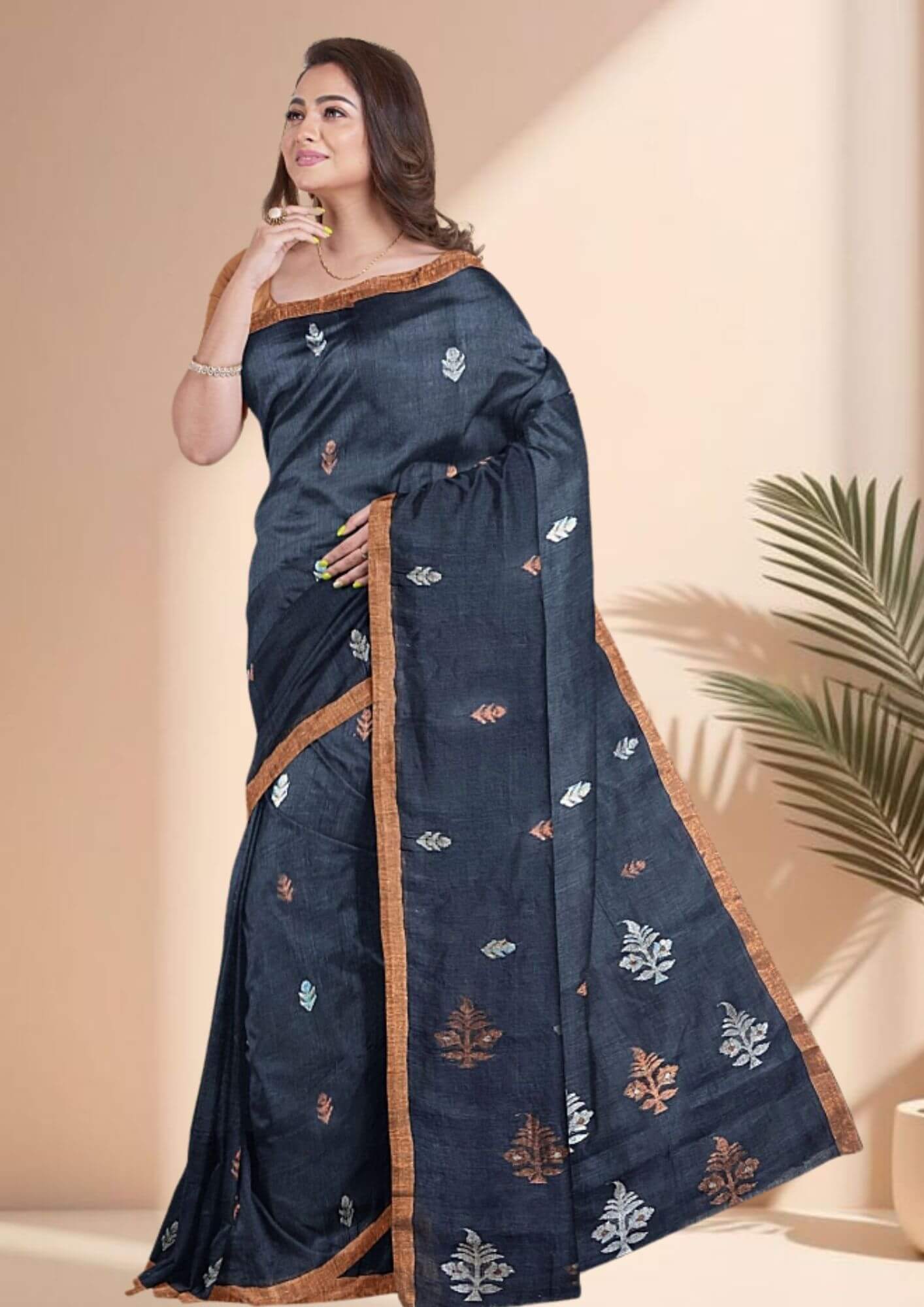 Experience the perfect harmony of classic tradition and modern style with our exclusive handwoven Jamdani linen saree. This piece is a true testament to the beauty of skilled craftsmanship, offering a unique blend of elegance and comfort. Crafted from premium linen, the saree boasts a beautiful, natural texture that is both lightweight and breathable, making it a perfect choice for all-day wear. The striking contrast of deep black and vibrant fiery orange creates a bold and contemporary statement, ensuring you stand out in any crowd. Ideal for festive occasions, evening gatherings, or a sophisticated day look, this saree is a celebration of timeless design and exceptional artistry. It comes with a matching blouse piece, allowing for a complete, coordinated ensemble.