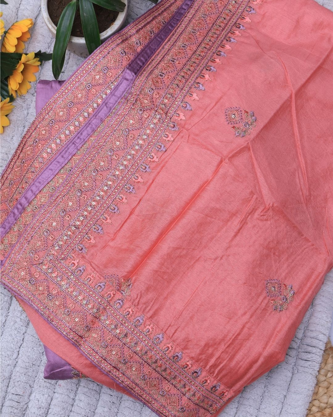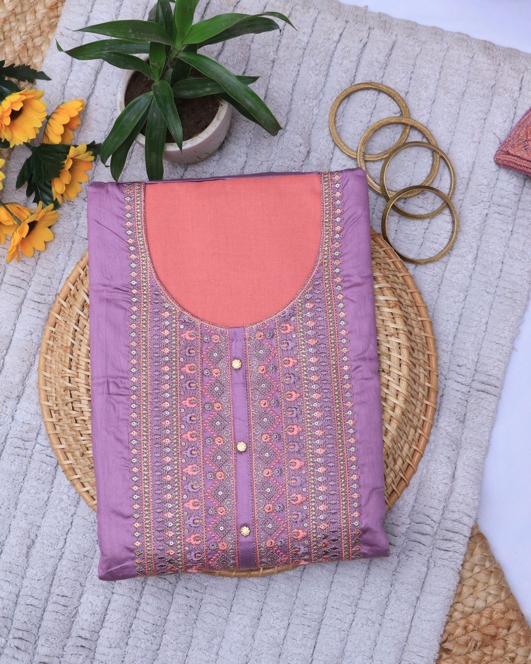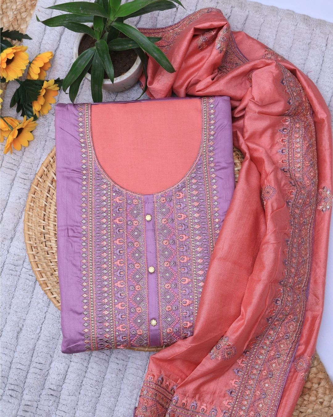 Step into timeless elegance with this exquisite Mauve and Pink Unstitched Suit Set. Crafted from a luxurious Cotton Silk blend, this ensemble offers the perfect balance of rich texture, gentle sheen, and breathable comfort. The soothing mauve shade, beautifully contrasted with delicate pink accents, makes this suit a perfect choice for festive occasions, daytime events, or sophisticated daily wear.