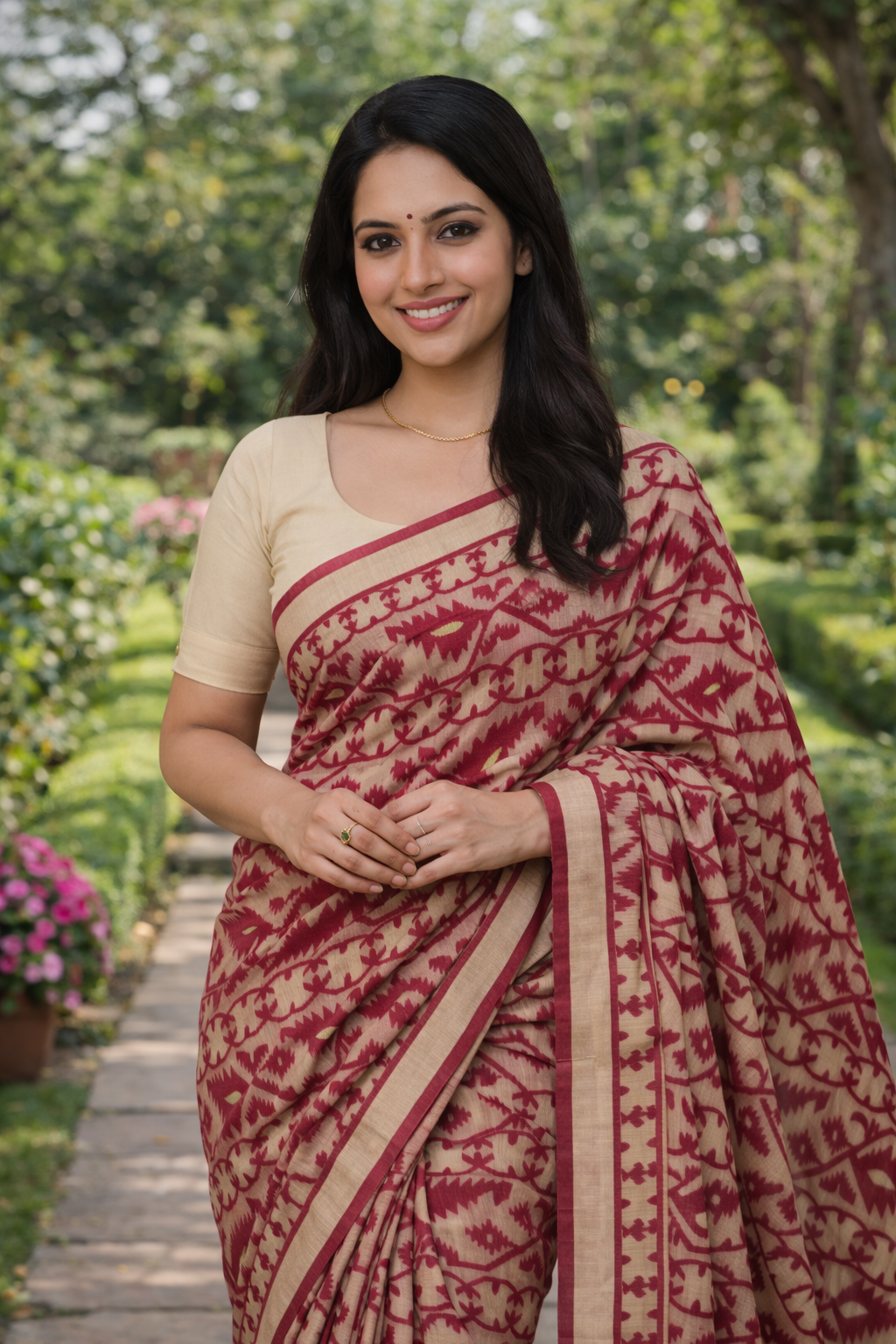 Infuse your wardrobe with the poetic grace of Bengal. This Semi Dhakai Jamdani saree is a masterpiece of light and shadow, featuring the iconic "disappearing" weave that has fascinated royalty for centuries. The deep, intoxicating off-white shade  provides a regal canvas for the delicate, Wine threadwork, creating a look that is both vintage and viscerally modern.