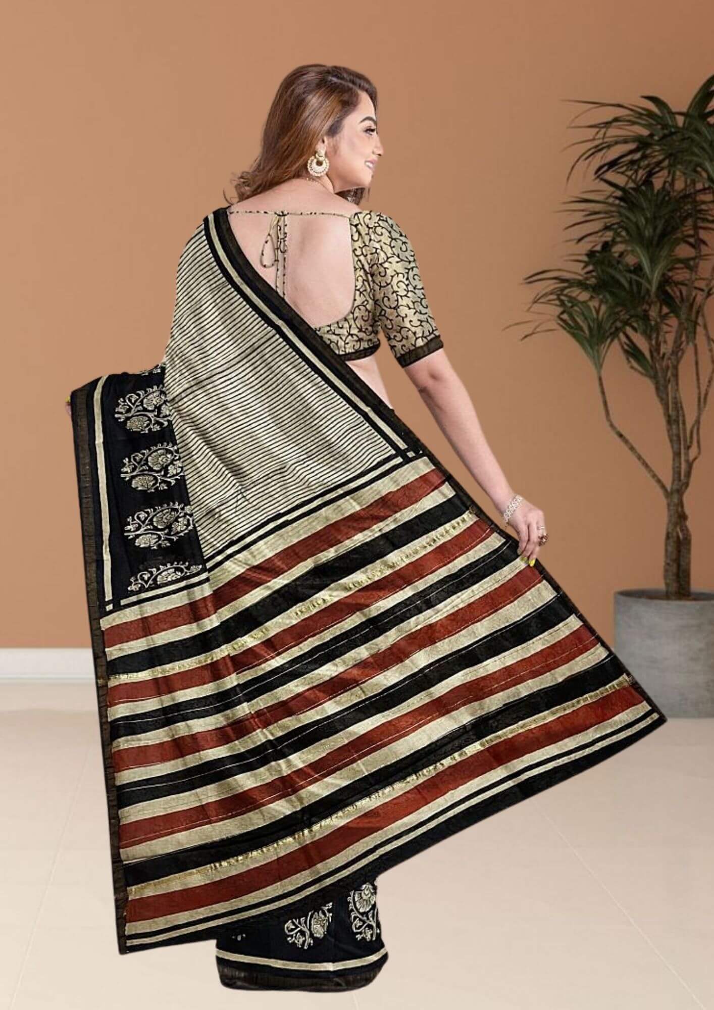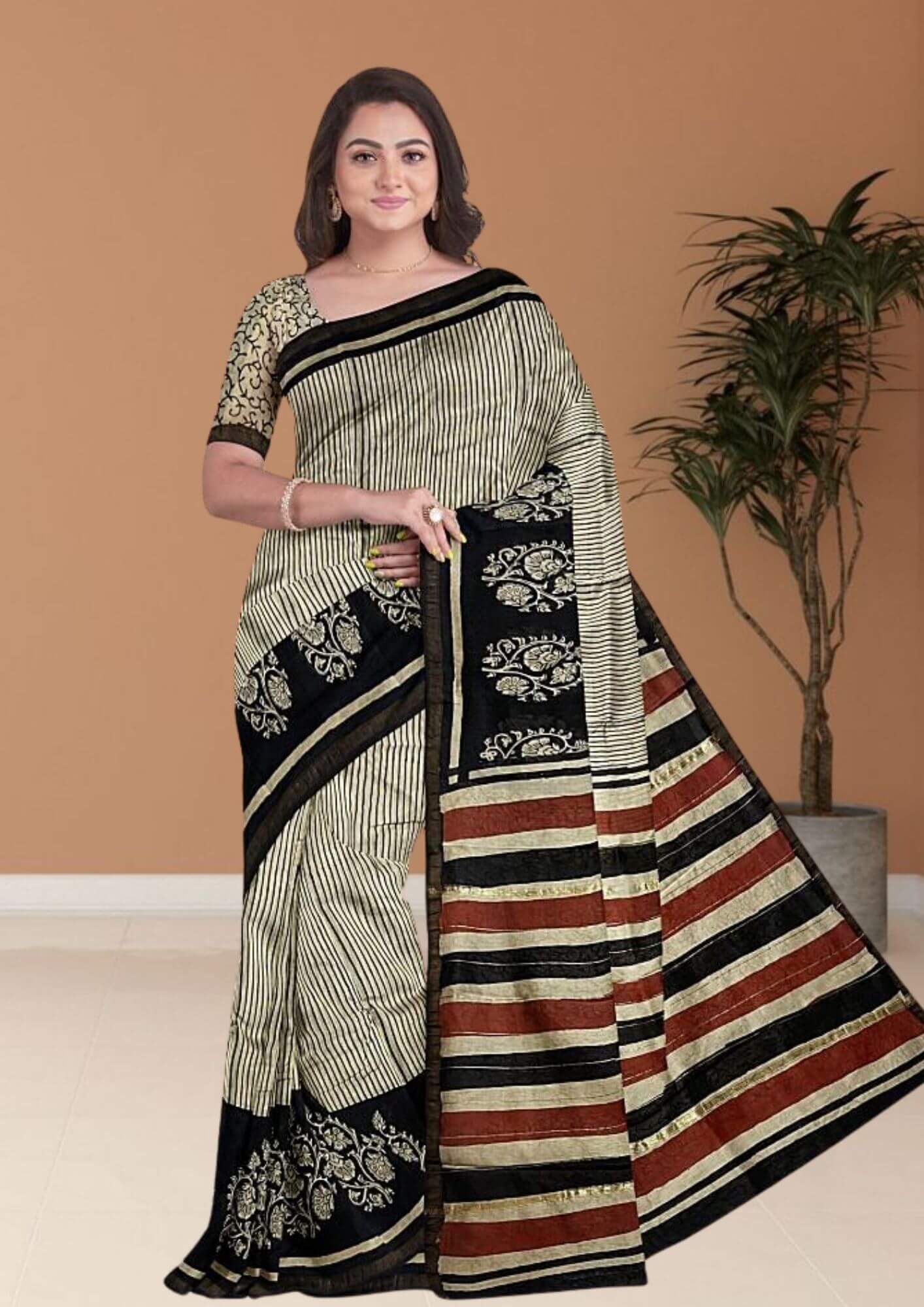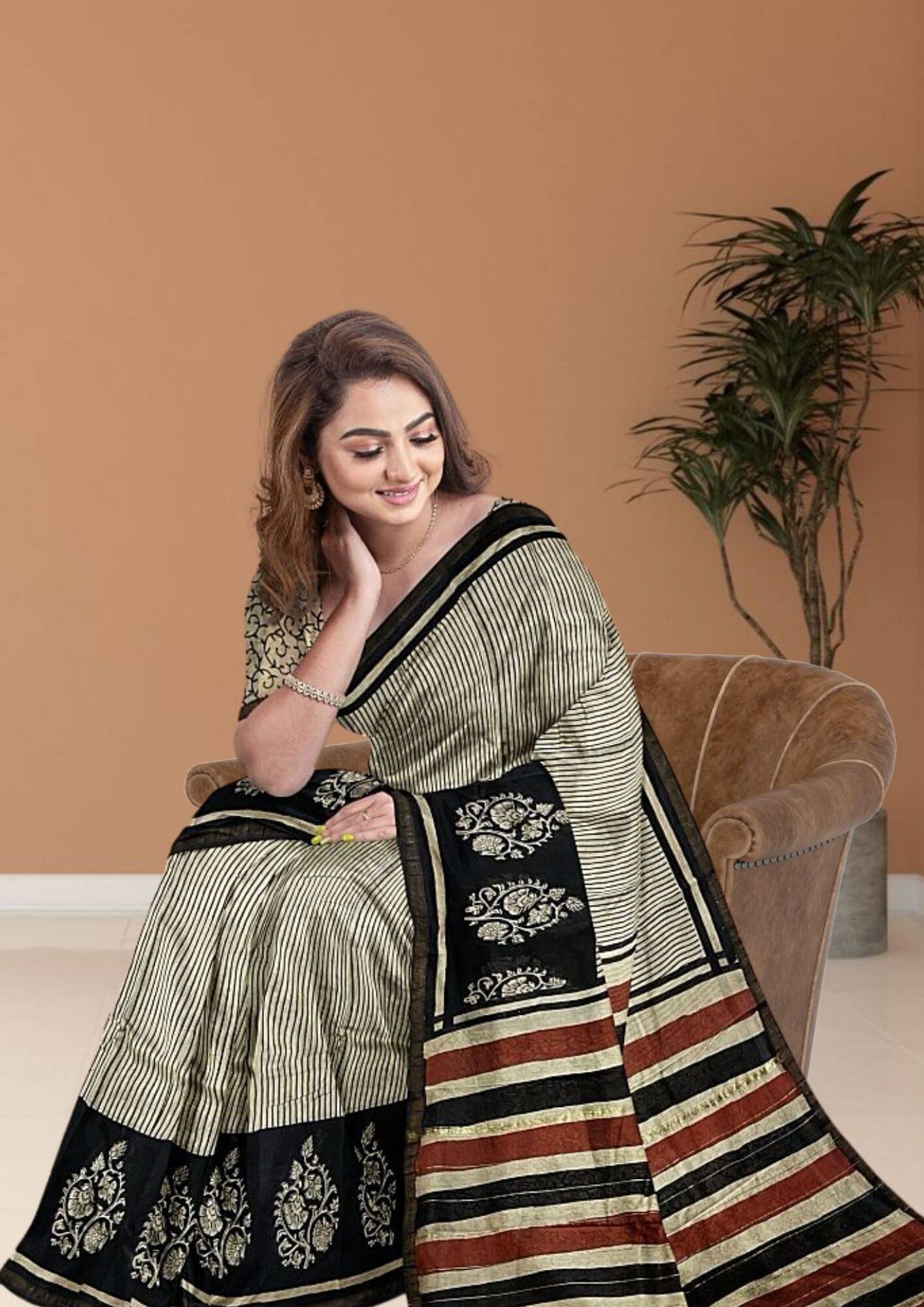 Embrace timeless sophistication with this elegant saree, a perfect blend of classic design and luxurious fabric. Crafted from a fine Chanderi cotton silk blend, this saree offers the best of both worlds: the structured drape of silk and the breathable comfort of cotton. Its lightweight texture and soft feel make it an ideal choice for both professional and festive settings. The design features a striking and eternally chic pattern of black and white stripes. This bold yet minimalist motif creates a powerful visual statement, offering a modern twist to traditional Indian wear. The clean lines and monochromatic palette make this saree incredibly versatile and easy to style, allowing it to be a staple in any wardrobe. The subtle sheen of the Chanderi fabric adds a touch of understated luxury, ensuring you look effortlessly polished. Whether you're heading to a formal office event, a casual day out, or a festive gathering, this saree is the epitome of sophisticated style. It's a testament to the fact that simplicity can be the most powerful form of elegance.