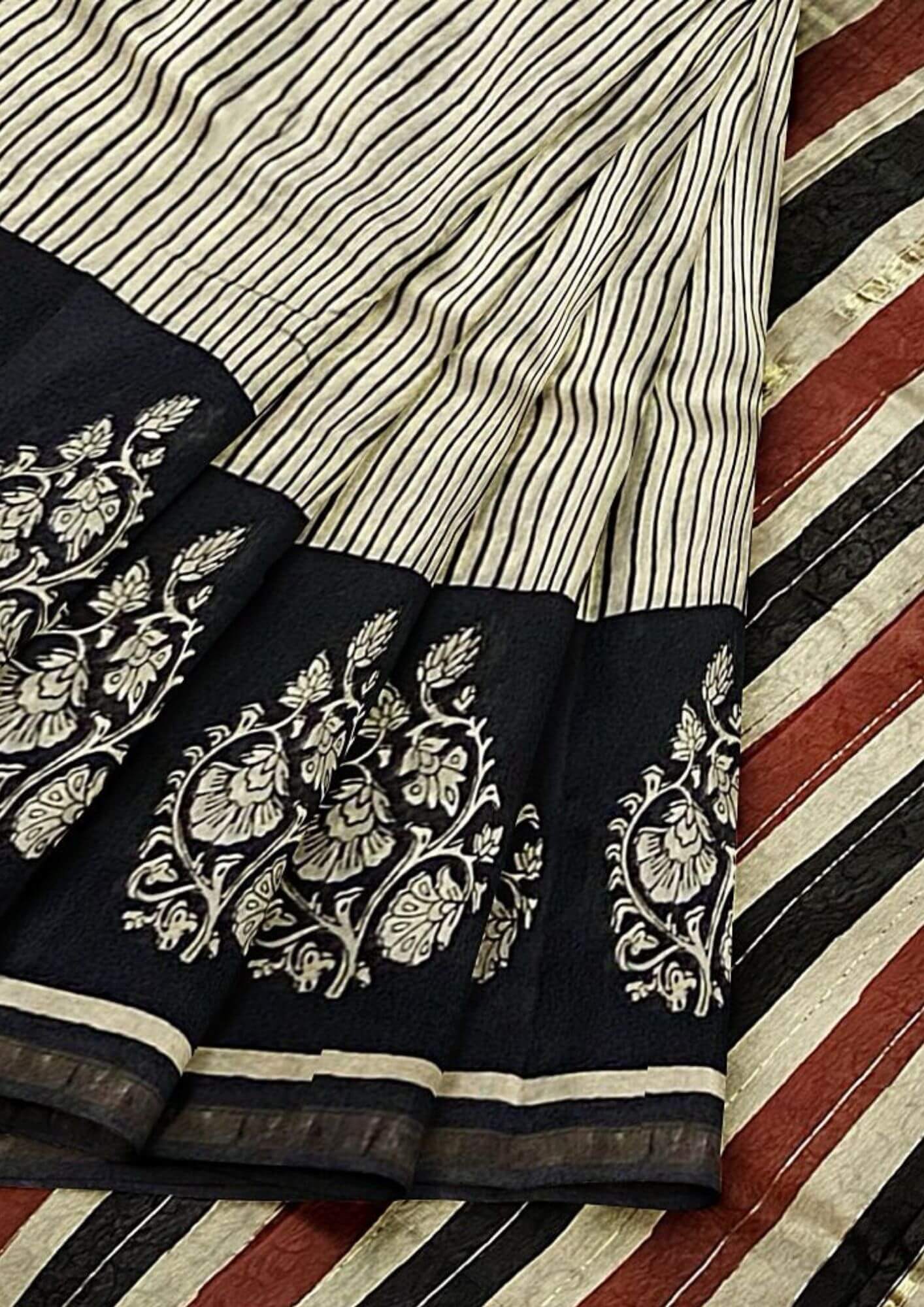 Classic Stripe Black & White Printed Chanderi Cotton Silk Saree