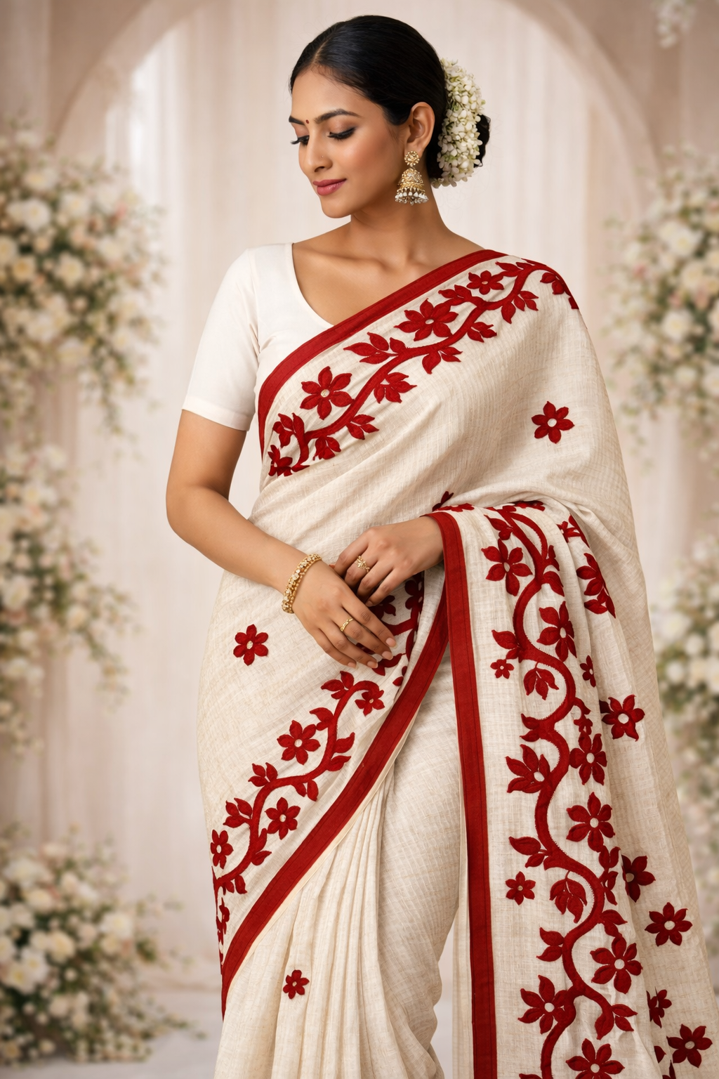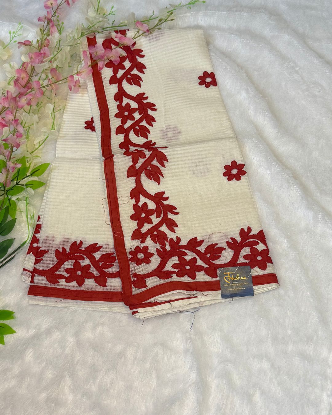 White & Bold Red Appliqué Kota Cotton Saree